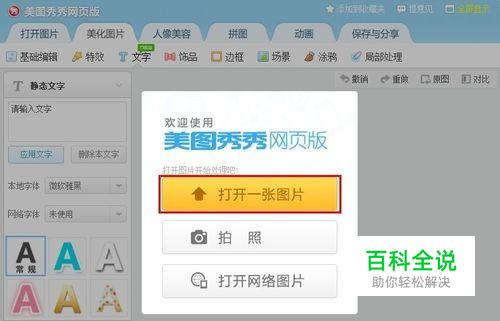 打开美图秀秀网页版,网址:http://xiuxiu.web.meitu.com/decorate/text/;进去后打开一张图片。