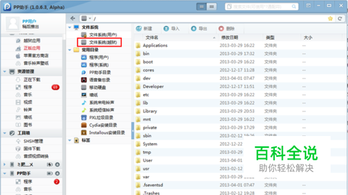将设备连接电脑打开PP助手--文件--文件系统(越狱)