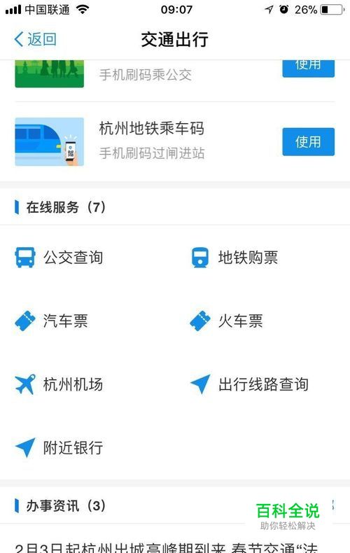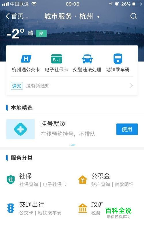 进入支付宝首页后,选择<城市服务>项,进入后如下图所示,选择页面中部的交通出行。