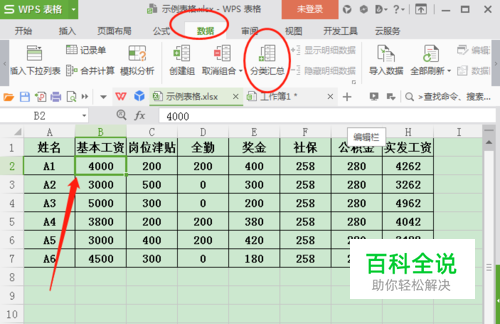 选中表格数据中的任意位置,然后点击菜单栏的‘数据’,再点击‘分类汇总’(如图);