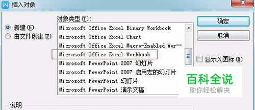 点击“对象”后,出现如图所示界面。可以选择插入新建对象和已存在的对象。现在,首先来介绍插入新建对象,我们找到新建里面的“Microsoft office excel workbook”选项。
