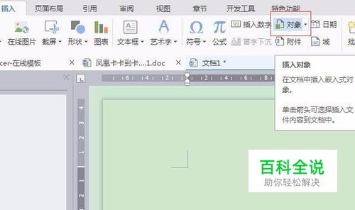 首先,打开WPS文字,找到“插入”面板下的“对象”功能,如图所示。