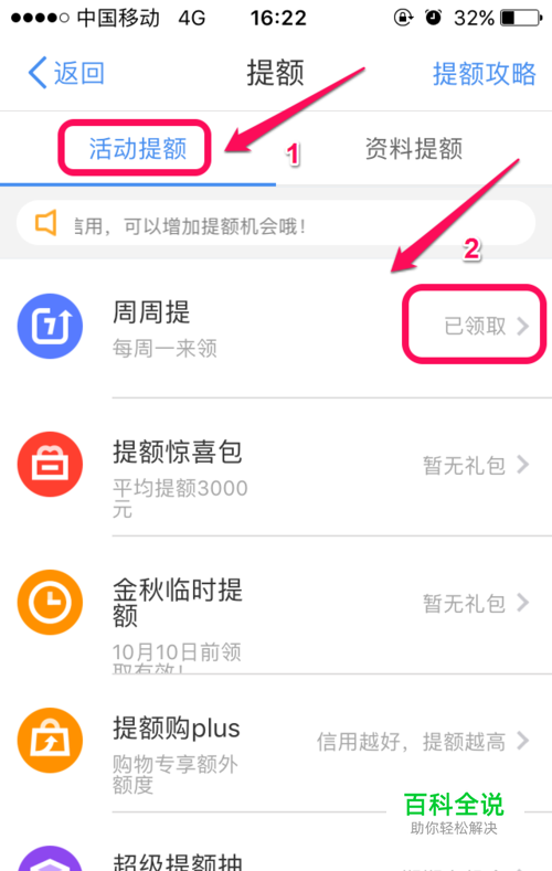 点开提额后可以看到主要有两大板块,【活动提额】和【资料提额】,这里先说【活动提额】,首先来看【周周提】:【周周提】很好理解,就是每周提额一次,这个提额较低,每次十元或二十元左右,但是总之积累。