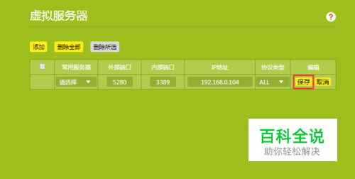 将内部端口(应用程序的端口,如远程桌面默认3389)、外部端口(外网访问的端口),及刚刚绑定的内网IP地址填写之后点击保存。到此就完成了端口映射的设置。