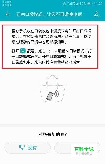 第一步我们首先需要知道口袋模式主要防止手机放在口袋或者包里漏接电话,开启之后,放在口袋或者包里,来电铃声会增大,如下图所示: