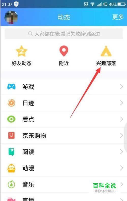 第二,进入动态界面后,点击右侧“兴趣部落“。