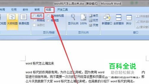 首先我们需要把word标尺调出来,默认的word文档是不显示word标尺的,我们只需要点击word中的视图菜单,然后找到标尺选项,勾选就可以了。
