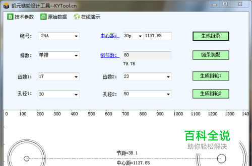 输入小链轮的齿数,孔径,大链轮的齿数,孔径,可以从下拉列表中选,如果没有选项的话也可以手动输入,输入数据后下方的显示区域会动态显示外观样式。
