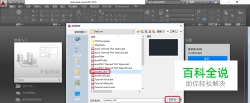 打开Auto CAD2016,单击新建按钮,选择图形样板,如图,单击打开。