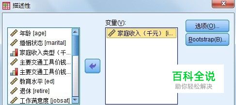 选择变量。从源变量列表中选择需要描述的变量,导入“变量”列表“中。本例中对”income(收入)“这一变量进行描述。