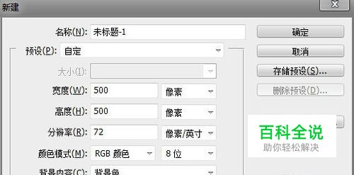 打开PS,新建一个500PX乘500PX的背景图,如下图所示: