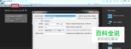打开MySQL Workbench,并连接数据库。图中显示连接数据库对话框