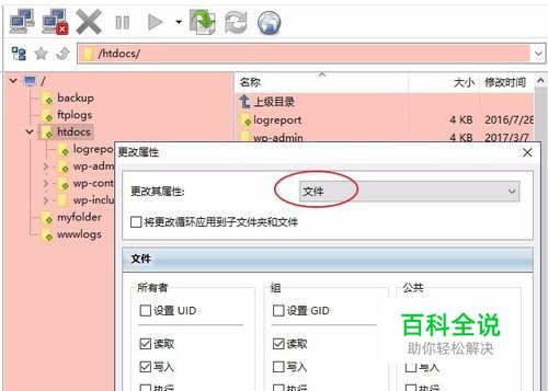 弹出对话框后,“更改其属性”选择“文件”,下面的“权限”左边的输入框输入644,并确定。