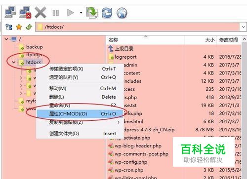 1. 修改网站文件及文件夹的权限。鼠标右键点击网站文件根目录,弹出菜单,选择“属性(CHMOD)”。