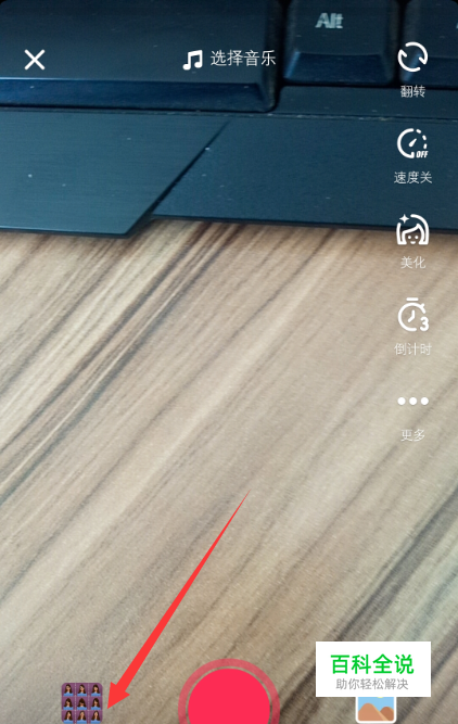点击加号之后来到设置页面,可以切换前置后置摄像头、选择一首好听的音乐、调整速度和美化,这些可以选择使用,之后点左下方的道具。