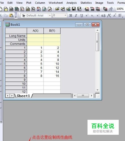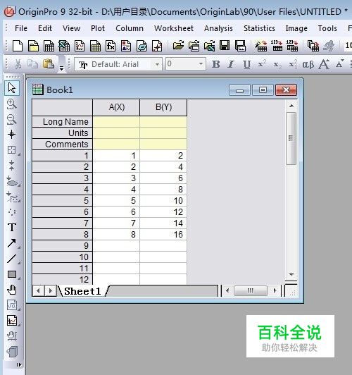 首先,打开origin 9.0软件,输入数据,如图所示,小编在此随便输入点数据为大家做示范