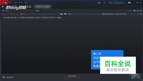 点击左上角的“steam”弹出下拉菜单,点击备份或恢复游戏。