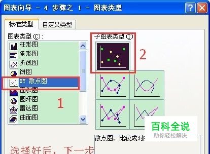第二步:打开图表对话框,选择XY散点图,“子图表类型”为第一个,“下一步”