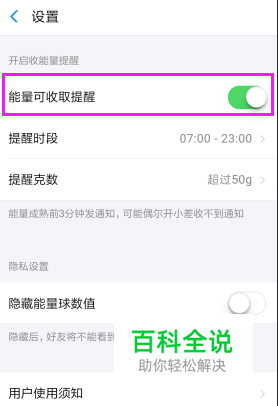 点击【能量可收取提醒】。开启后按钮会变成绿色的。