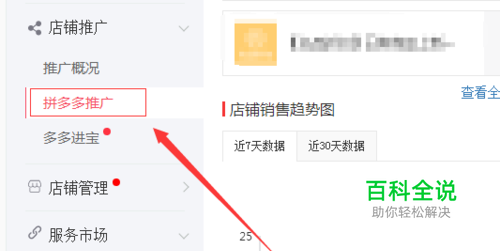 进入拼多多商家后台管理主页面,点击后台主页左侧的 店铺推广 选项,展开店铺推广 子选项,子选项包括,推广概况,平多多推广,多多进宝等选项,如下图所示;