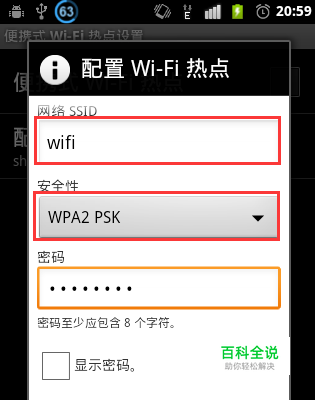 在配置WiFi热点页面上的 网络SSID输入框中输入WiFi热点的名称, 安全性选择为“ WPA2 PSK”,输入WiFi热点的连接密码,如果不想设密码,将 安全性选择为“ 开放”就可以了。然后点击“ 保存”按钮。