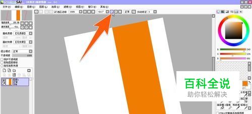 在SAI中要旋转画布的方法有几种,先说第一种,如果要让这个画转旋转方向,那么可以点击上方的那个旋转按钮,有逆时和顺时两种旋转方式,如下图箭头所指。