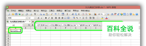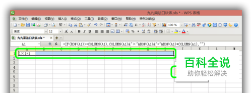 在A1单元格输入公式 : =IF(ROW(A1)>=COLUMN(A1),COLUMN(A1)&"×"&ROW(A1)&"="&ROW(A1)*COLUMN(A1),"")。