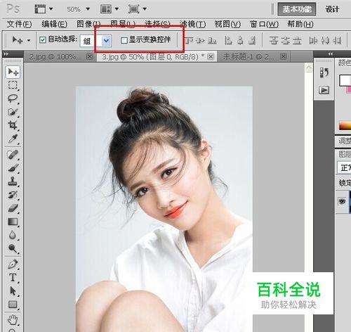 在图像窗口中选择要进行变形的图像,或者当前图层不是背景层时,选择工具箱中工具,在选项栏中勾选【显示变换控件】复选框。