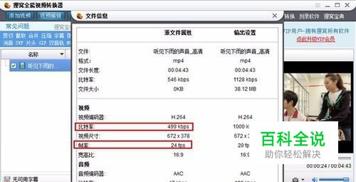 添加好了视频文件之后,选中刚刚添加的视频文件并右击,在弹出的菜单中选择“文件信息”,然后会弹出如下图所示的对话框,在这个对话框中我们可以看到视频的大小、比特率和帧率等一系列参数,先记住这里的相关参数,后面会用得到。