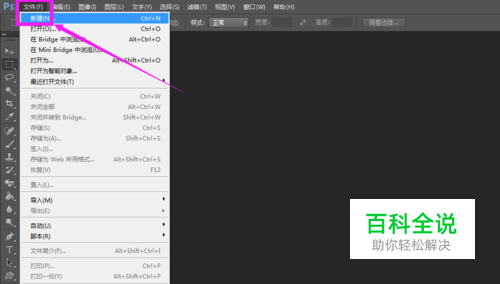 在自己的电脑上启动打开了ps的界面后,在左上角处点一下导航栏里的”文件“,再在下拉列表选择一下”新建“。