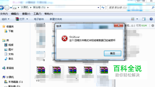 找到损坏的压缩文件打开会弹出文件损坏对话框,点击确定就默认关闭了,我们无法使用