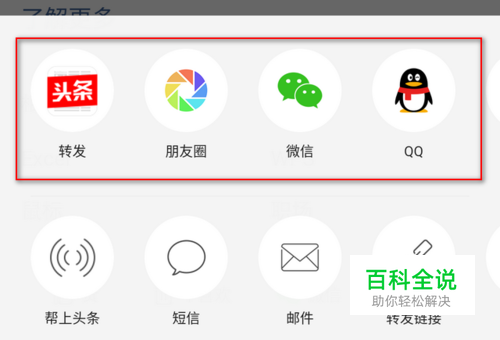 最常用的是前面4个选项。第一个选项表示将文章转发到今日头条上,这样你头条上的好友就可以看到它了。第二个选项表示转发到自己的微信朋友圈,第三个选项表示转发给自己的微信好友,第四个选项表示转发给自己的qq好友。这里以转发给自己的微信好友为例。