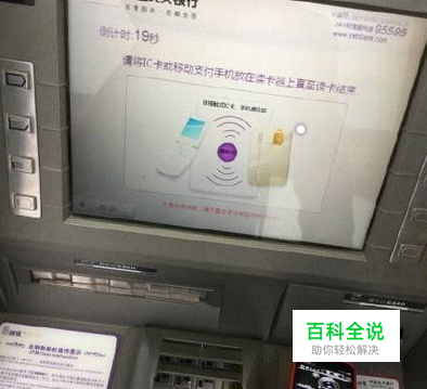 在ATM机钱选择Apple Pay取款那一项,ATM机会显示请将IC卡或移动支付手机放在读卡器上直至读卡结束,如下图