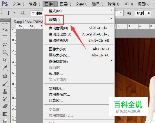 使用ps打开我们的需要的图片素材,然后再在图像菜单哪里找到调整选项,如图所示: