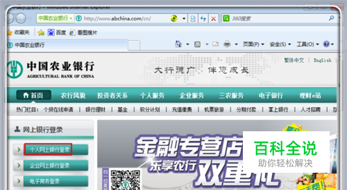 自动弹出农行网上银行的主界面后,有几种方式登录账户上,如“个人网上银行登录”、“企业网上银行登录”、“电子商务登录”。我们一般都是办理个人业务,因此,点击“个人网上银行登录”。