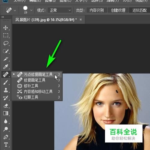 在操作界面的左侧这里调出污点修复画笔。