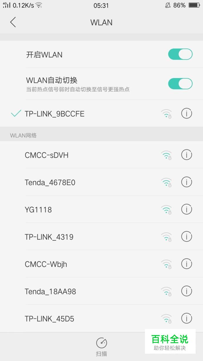 首先,连接好你需要查看的wifi,我们以下图这个"9BCCFE"为例子。