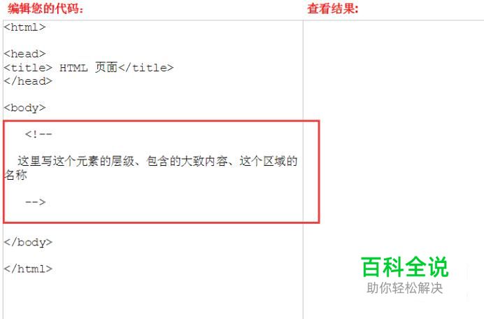 html注释的格式 html注释的格式是【 <!--代码块-->】,把注释的内容写在“<!--”和“-->”里面就可以了。这个表示多行或单行注释。 <!--这里写这个元素的层级、包含的大致内容、这个区域的名称-->