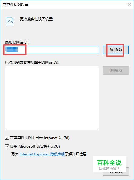 弹出的界面,我们输入我们想要兼容的网站,然后我们点击添加;