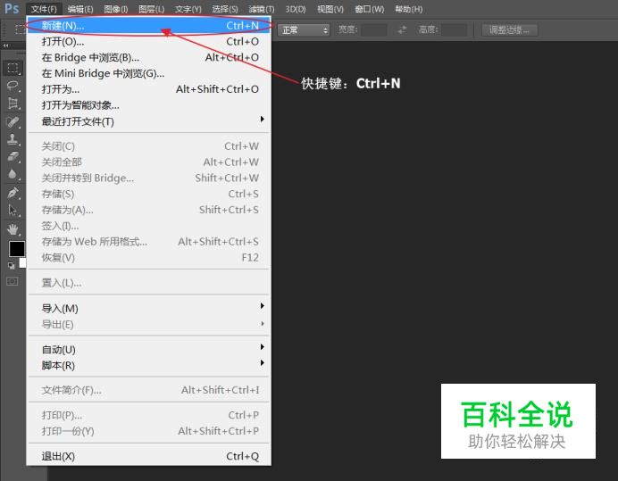 我们在刚打开PS时,如果需要开始一个新的工程则需要执行:“文件>新建”命令,以便快速建立新的文档。 注:这里我们还可以使用“Ctrl+N”快捷键方式,建立新文档。