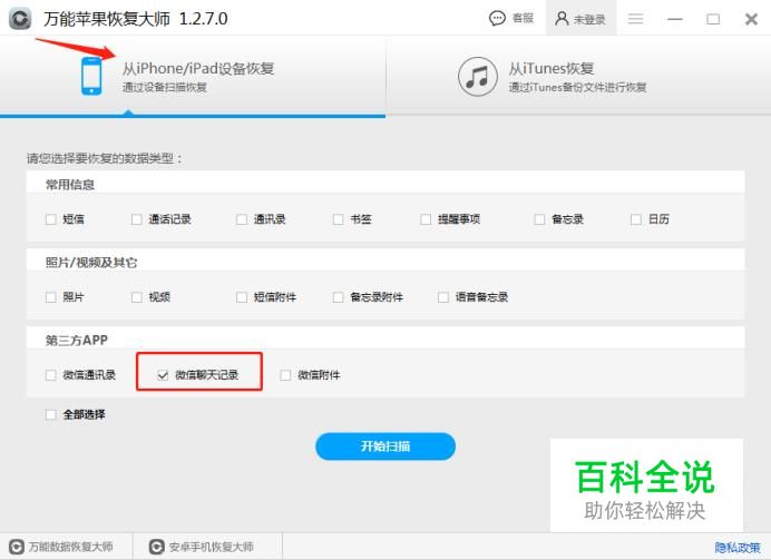 在界面上可以看到有【iPhone设备扫描恢复】和【iTunes备份恢复】,这里我们直接选择从iPhone设备扫描恢复。记得要将手机使用数据线连接到电脑上,这样软件会自动识别连接上手机后,会弹出数据类型选择界面,在界面上选择【微信聊天记录】,点击开始进入下一步。