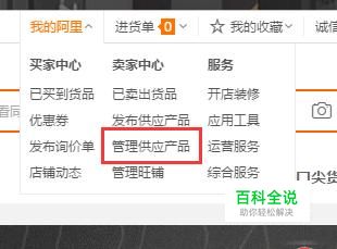 登录成功后,把鼠标停留在“我的阿里”按钮上,在弹出来的下拉窗口中,点击“管理供应产品”