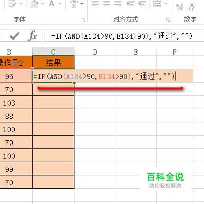 那么,这时,我们就要用到IF与AND函数。 在C134单元格输入公式:=IF(AND(A134>90,B134>90),"通过","") 公式解释:公式内里这一段用到AND函数,是要判断单元格是否大于90;那么,用IF函数就是配合AND函数,当AND函数判断出是真的话,那么,就显示为“通过”两字,否则单元格显示为空。