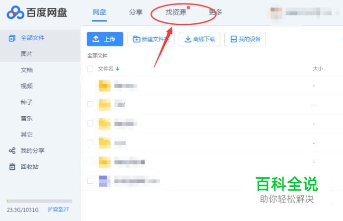 找资源 然后来到【百度网盘主页】,点击上方的【找资源】,如下图所示: