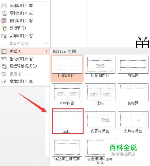 打开PPT自然后然后在左侧单击鼠标右键,在右键菜单哪里找到版式选项,点击该选项在其内找到空白选项,如图所示: