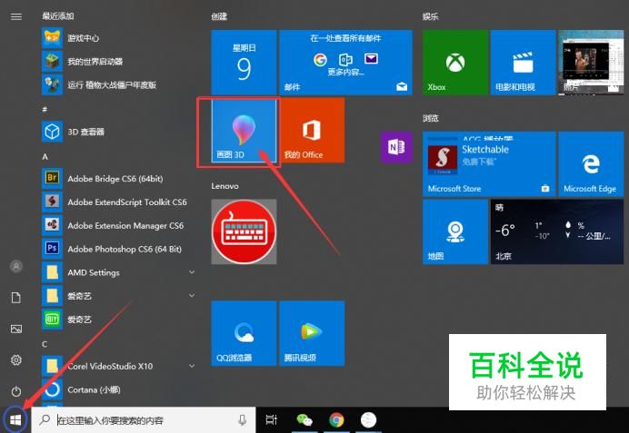 首先,我们点击win10电脑左下方的开始图标,找到画图3D,并且点击。