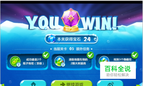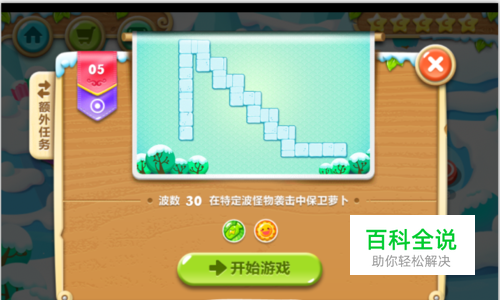 本关卡信息: 怪物波数:30 可用炮塔:绿瓶子、太阳花 太阳花售价:180 本关卡的额外任务(在关卡的左侧显示): 一、成功建造2个瓶子炮塔(顶级)。 二、消除地图左侧的2颗大树道具。 三、找到3个隐藏在道具中的炸弹星。 本关额外任务难度不大,可以随着金萝卜一起来拿下水晶萝卜。