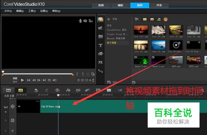 首先我们打开会声会影软件,将准备好的视频素材拖入到时间轴上,如下图所示
