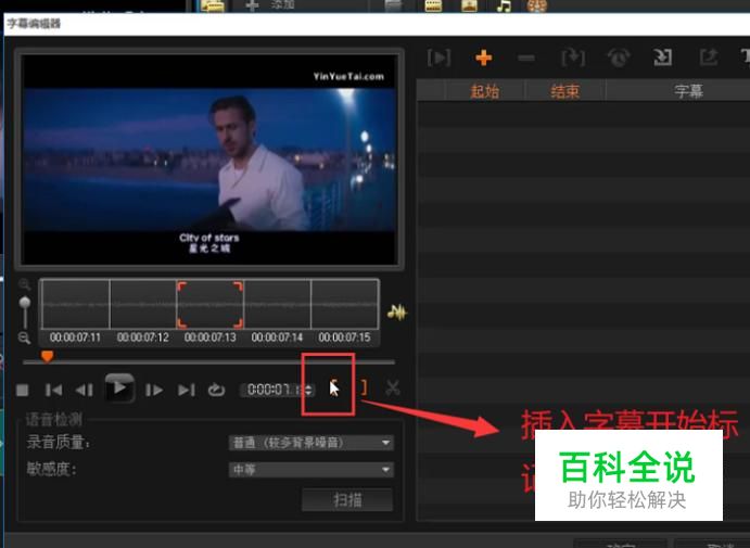 接下来在字幕编辑器界面中点击字幕开始标记插入开始节点,如下图所示