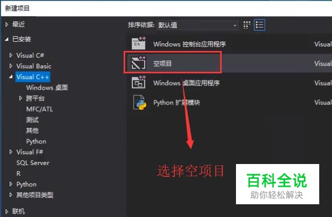 接下来在弹出的新建项目界面中左侧选择Visual C++,右侧选择空项目类型,如下图所示